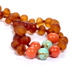 Бусы детские "Мятый шар" из Янтаря с бирюзой и кораллом